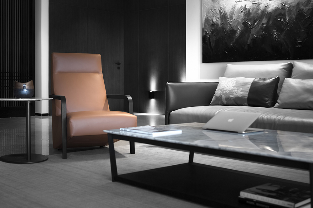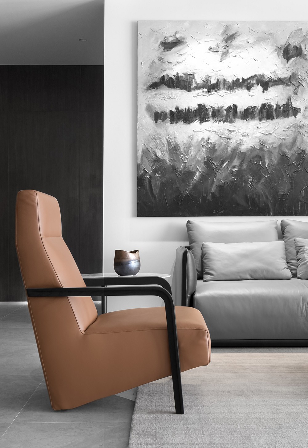 设计师考虑到整体色调与形态的和谐。灰黑白之间,零星地点缀着些橙色,沉稳中透着一些灵动;硬朗的瓷砖、玻璃和柔软的皮质沙发、休闲椅等搭配,刚柔有度……冷暖间的“度”和多少间的“量”,一切都“刚刚好”,“灰盒子”透着温柔的冷静、中正的深沉、温和的大气。