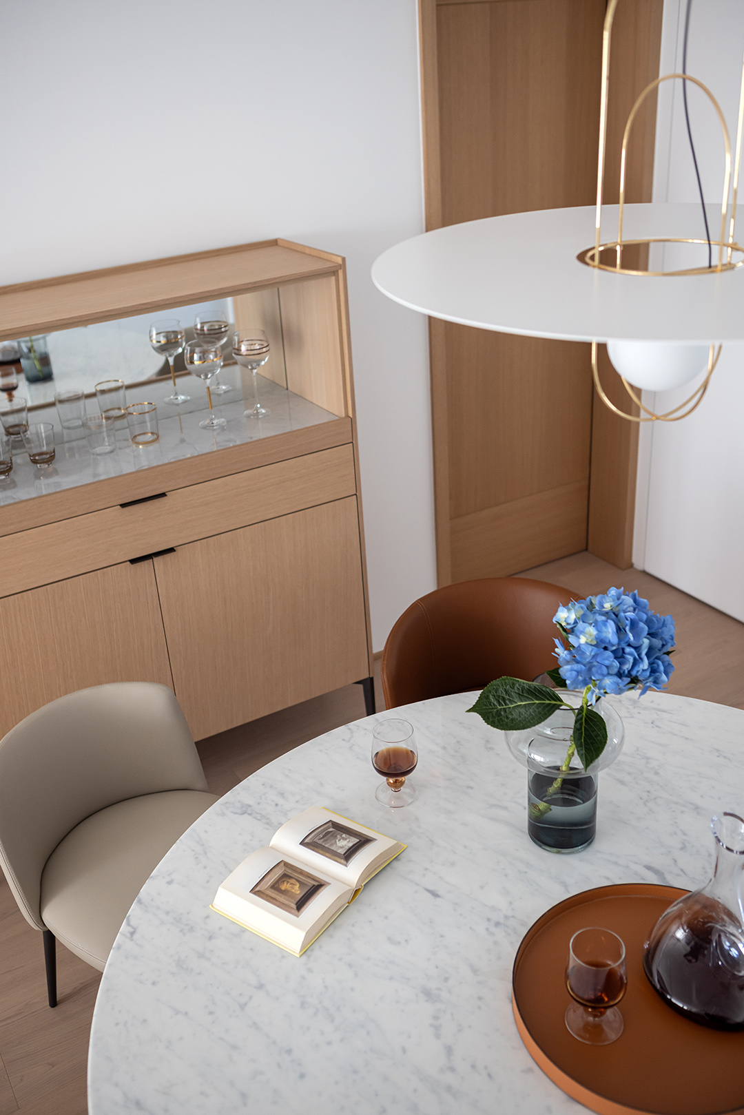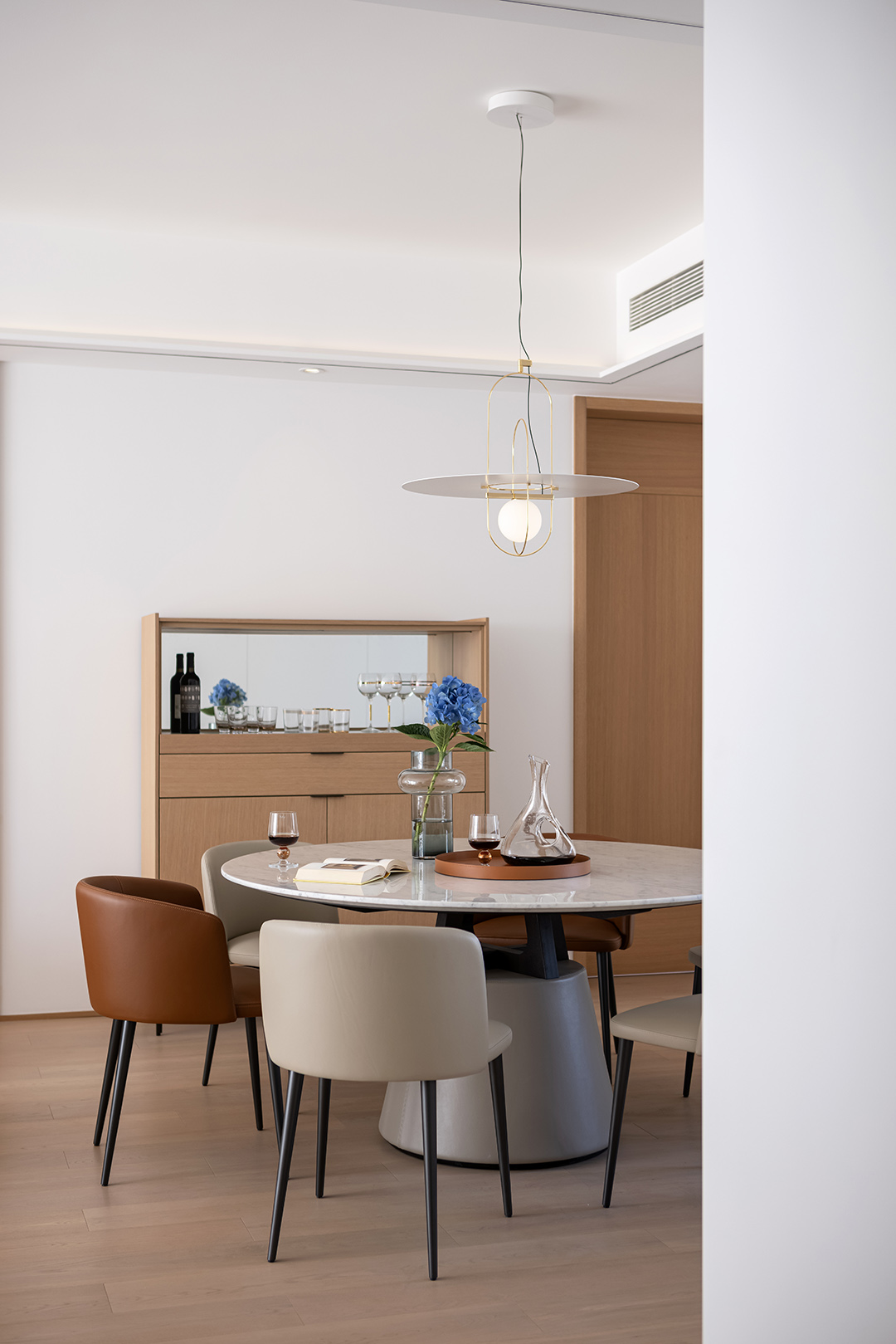 餐厅中UNITY家宴餐桌工艺细致精湛,BALLET芭蕾椅线条流畅优美。大理石桌面上方的鲜花清新夺目,为整个用餐区域增添了一份自然气息。