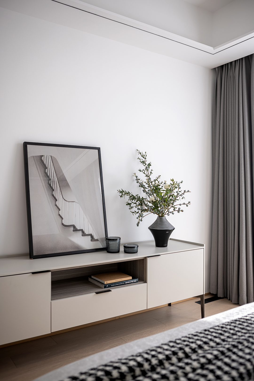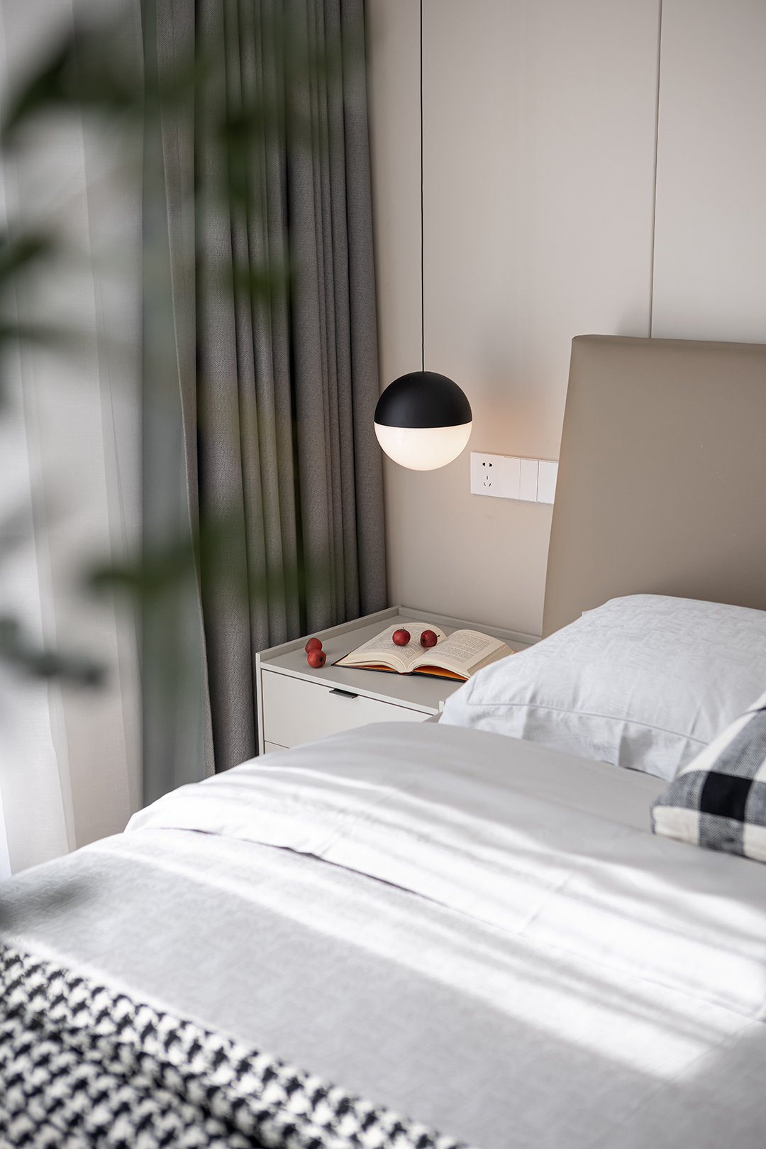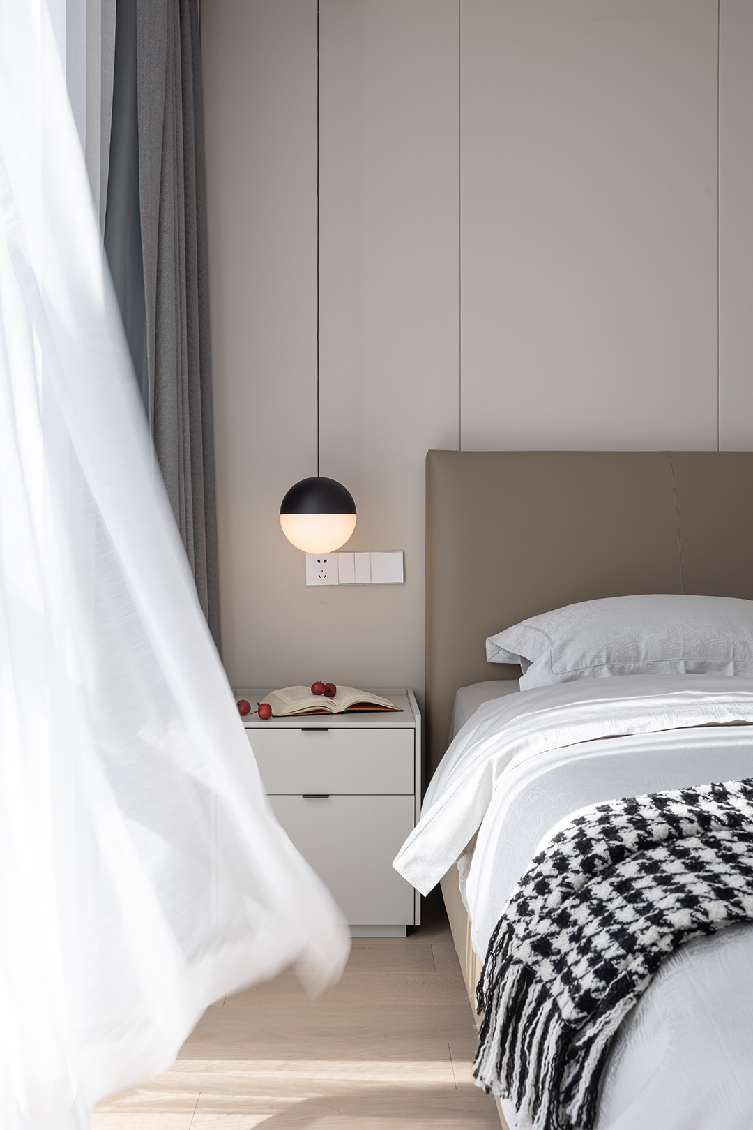 主卧柔和的配色结合天然的木质元素,营造出一种优雅静谧的休憩氛围。黑白相间的床品加入其中,形成差异化对比,同时也让空间的视觉层次更为丰富。