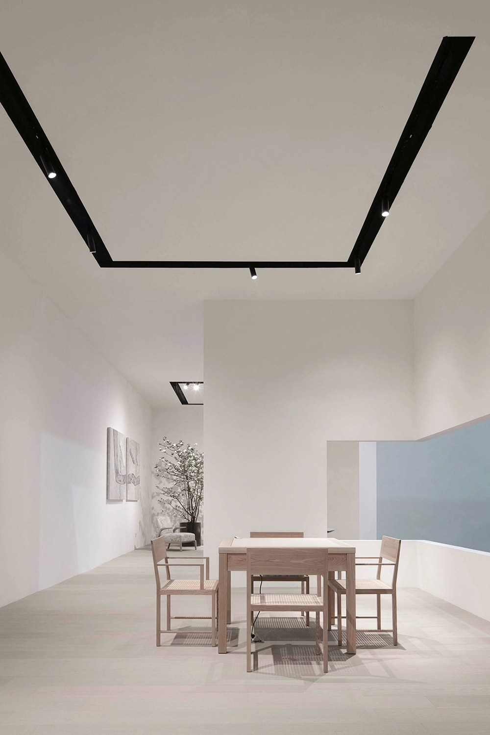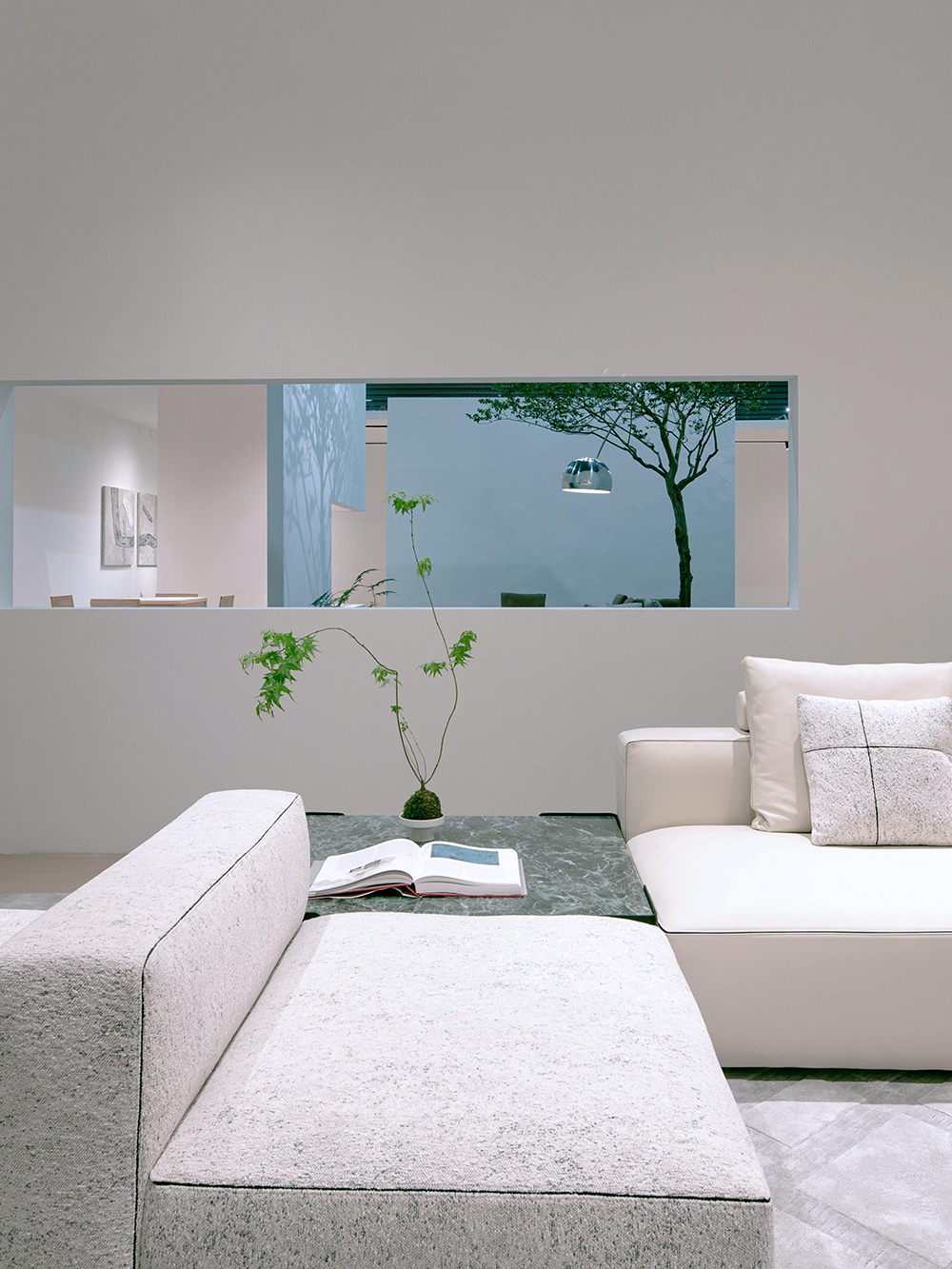 436㎡的“白盒子”中包含4大功能10个分区,入口长窗的设计,成为庭院风景的取景框,模糊了室内外的边界。沿着迂回的动线,使人在室内、室外之间不断切换。伴随着光影交错,在内外互动与对话间,体验人与自然和谐共处的生活方式。