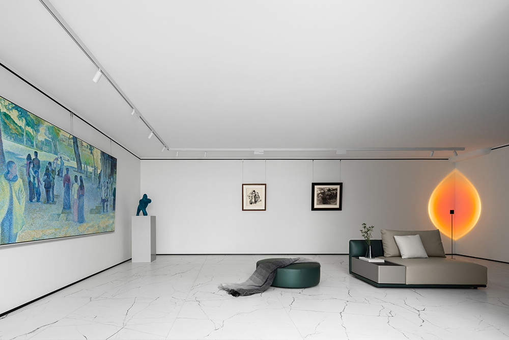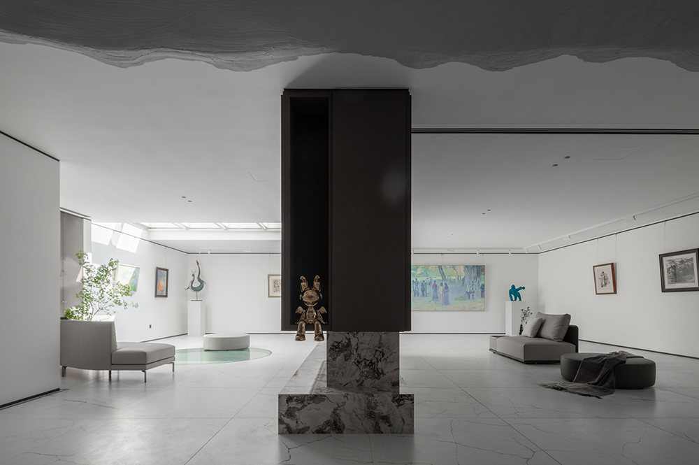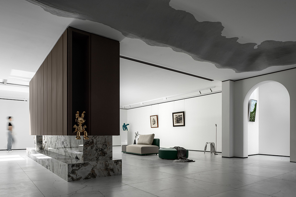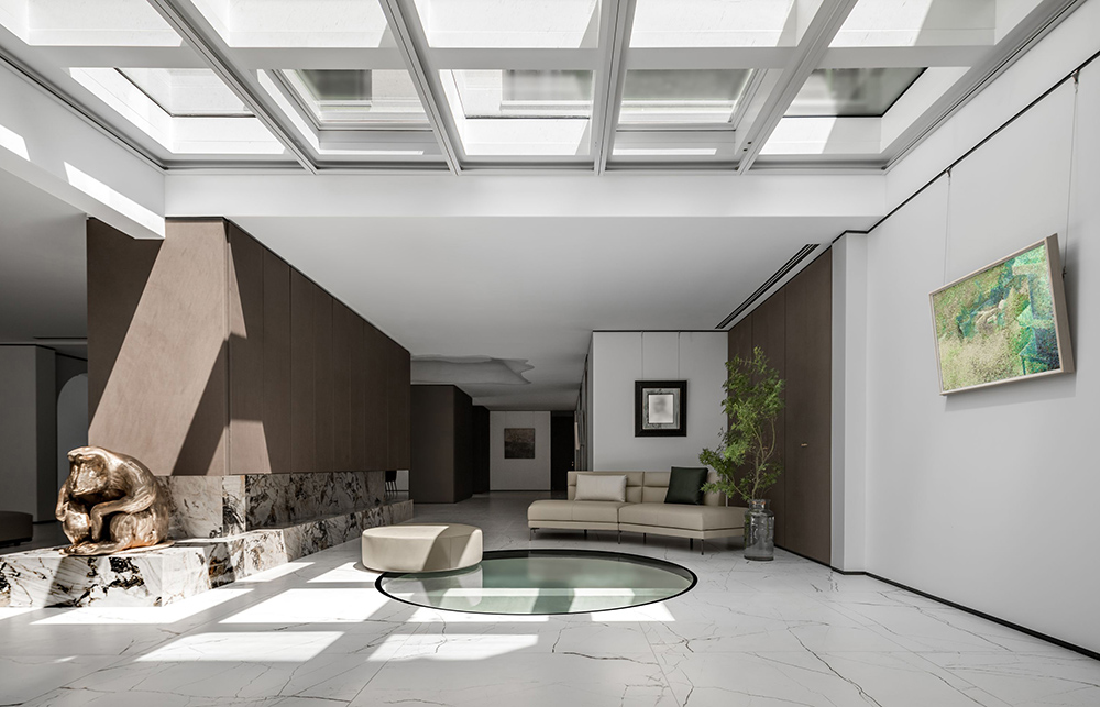 通透豁朗的空间,设计师用断续的体块贯穿中线,作出分区的同时也形成了一条洄游动线,从天窗映照之下的光圈开始。