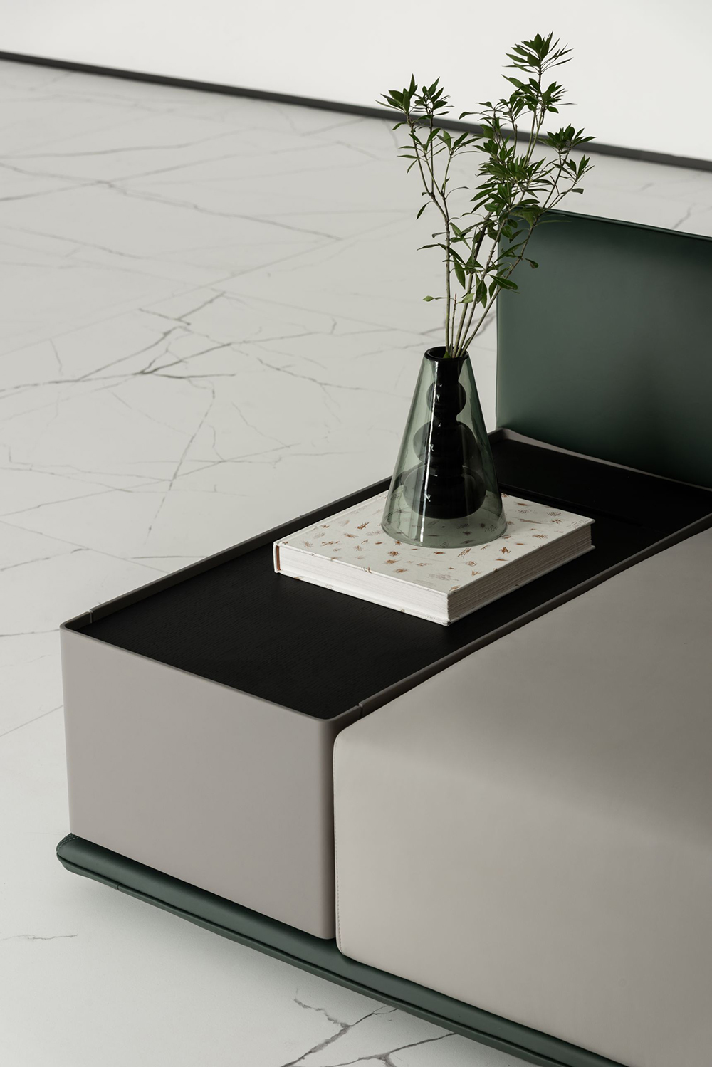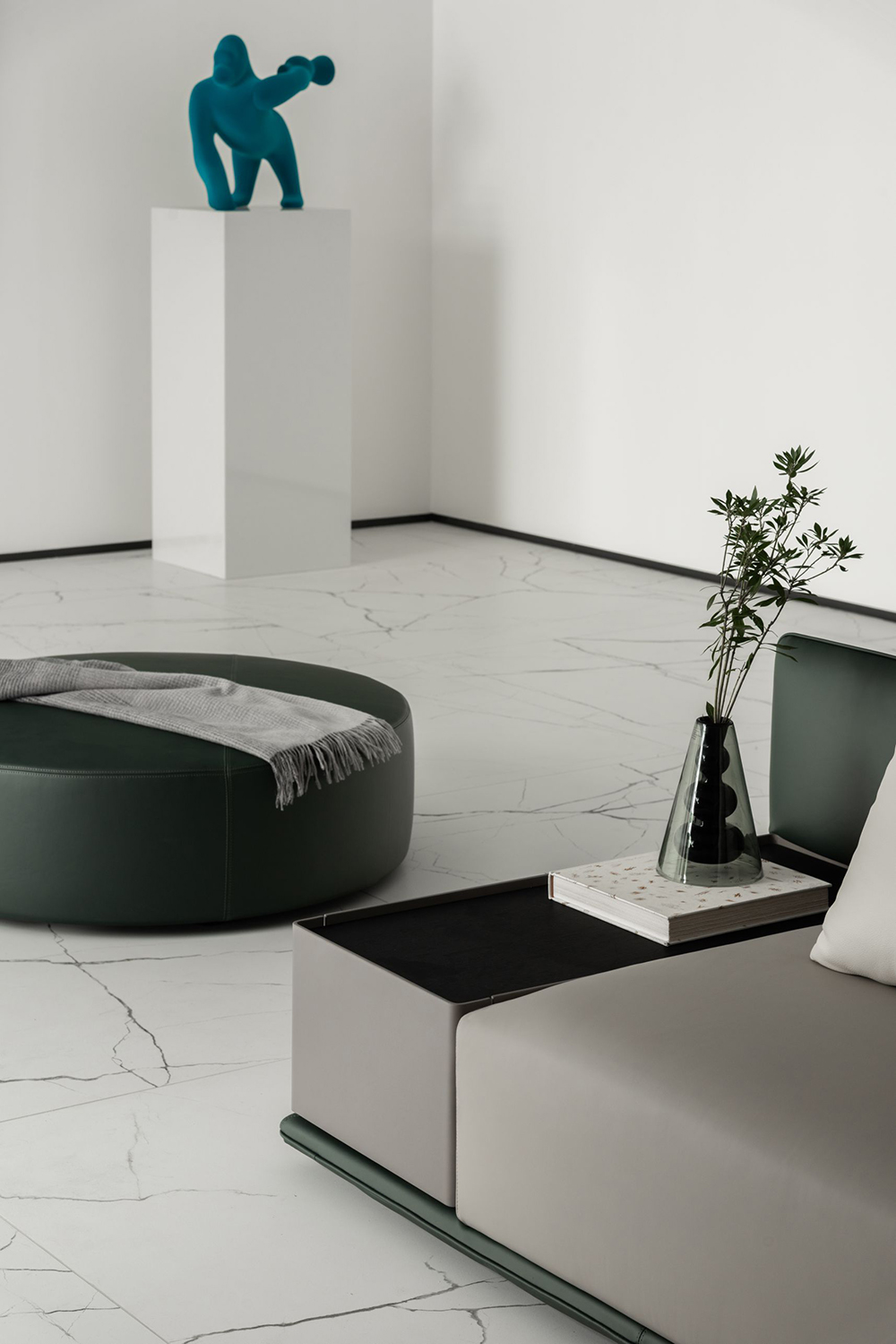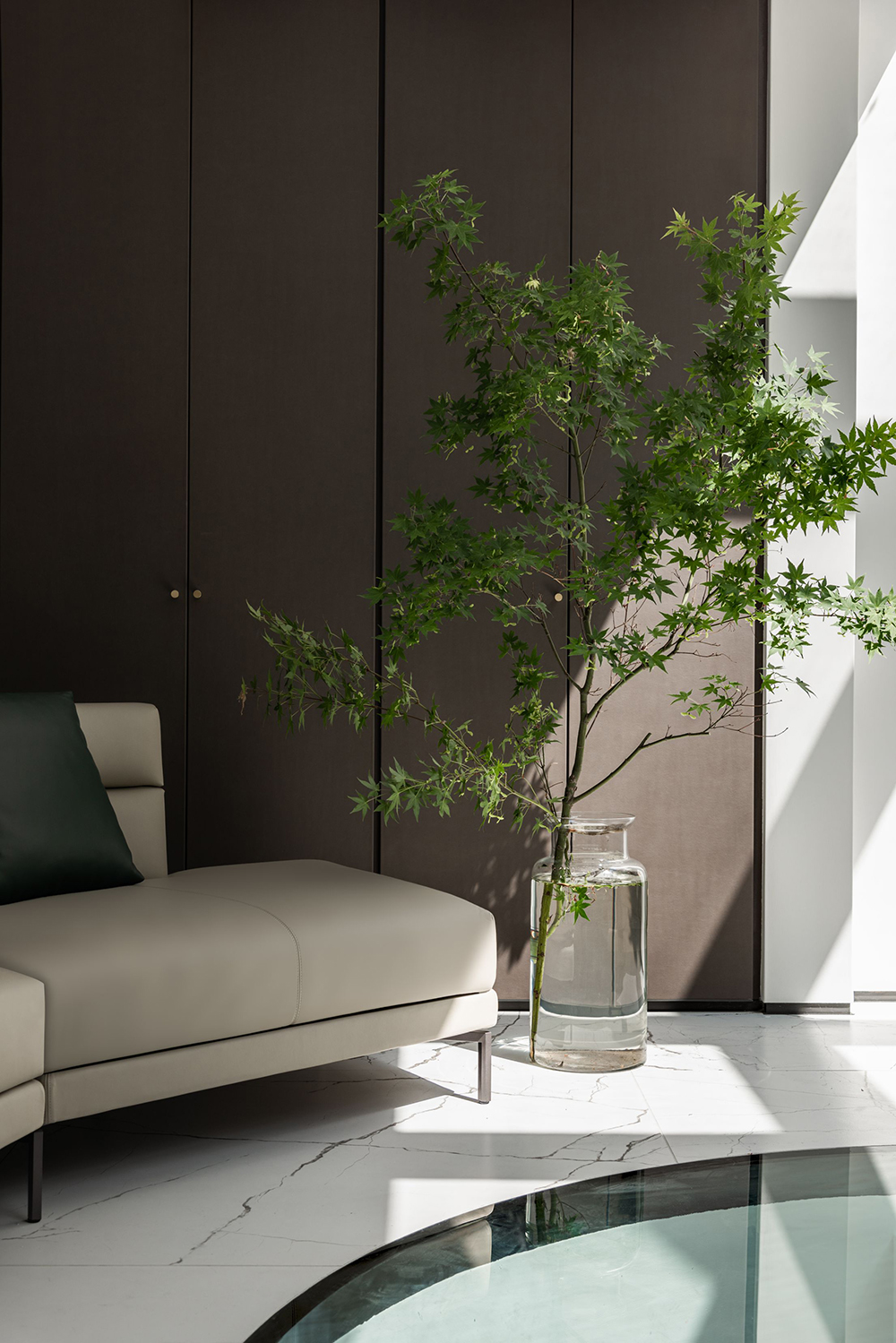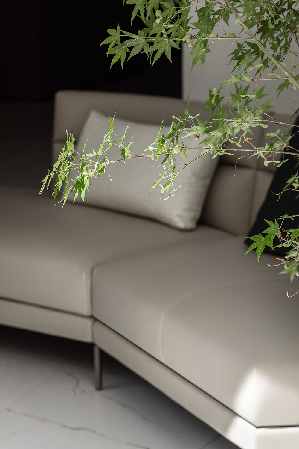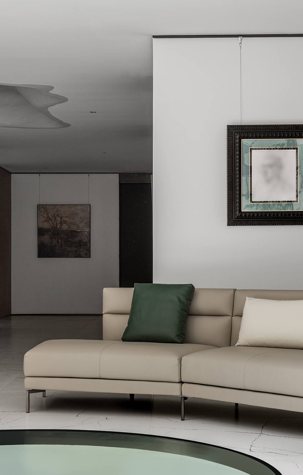 艺术展柜前的「依澜」沙发,柔软触感间有着依山傍水的惬意慵懒,侧畔宽扶手的设计正好放置美丽器物,饮茶品酒,皆自在。