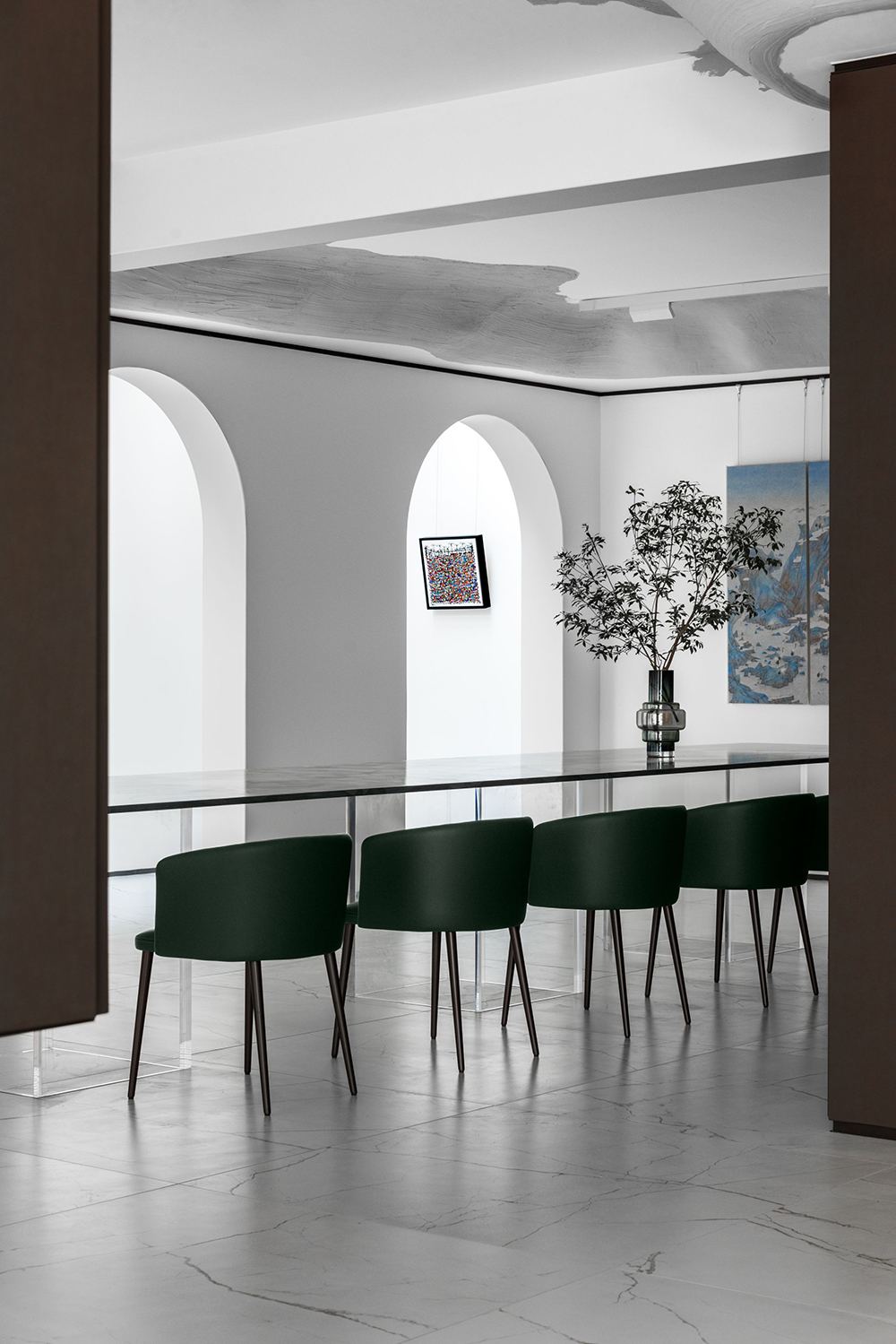 顺着墙边大幅的画作细观,再行至一道道拱门促成的光之长廊,最后在一列蓝白糅合的长案前落座,便完成了一回合的“美术馆巡游”。
