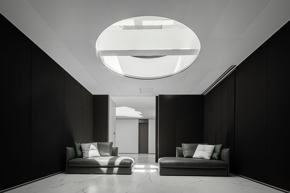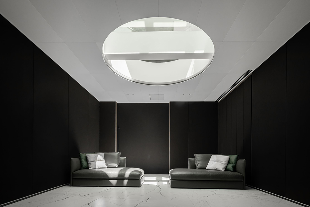 B2层,黑色降噪墙壁围合出影音娱乐区,圆形的天井将光引入,使得地下二层的空间仍然可以盈动透彻。