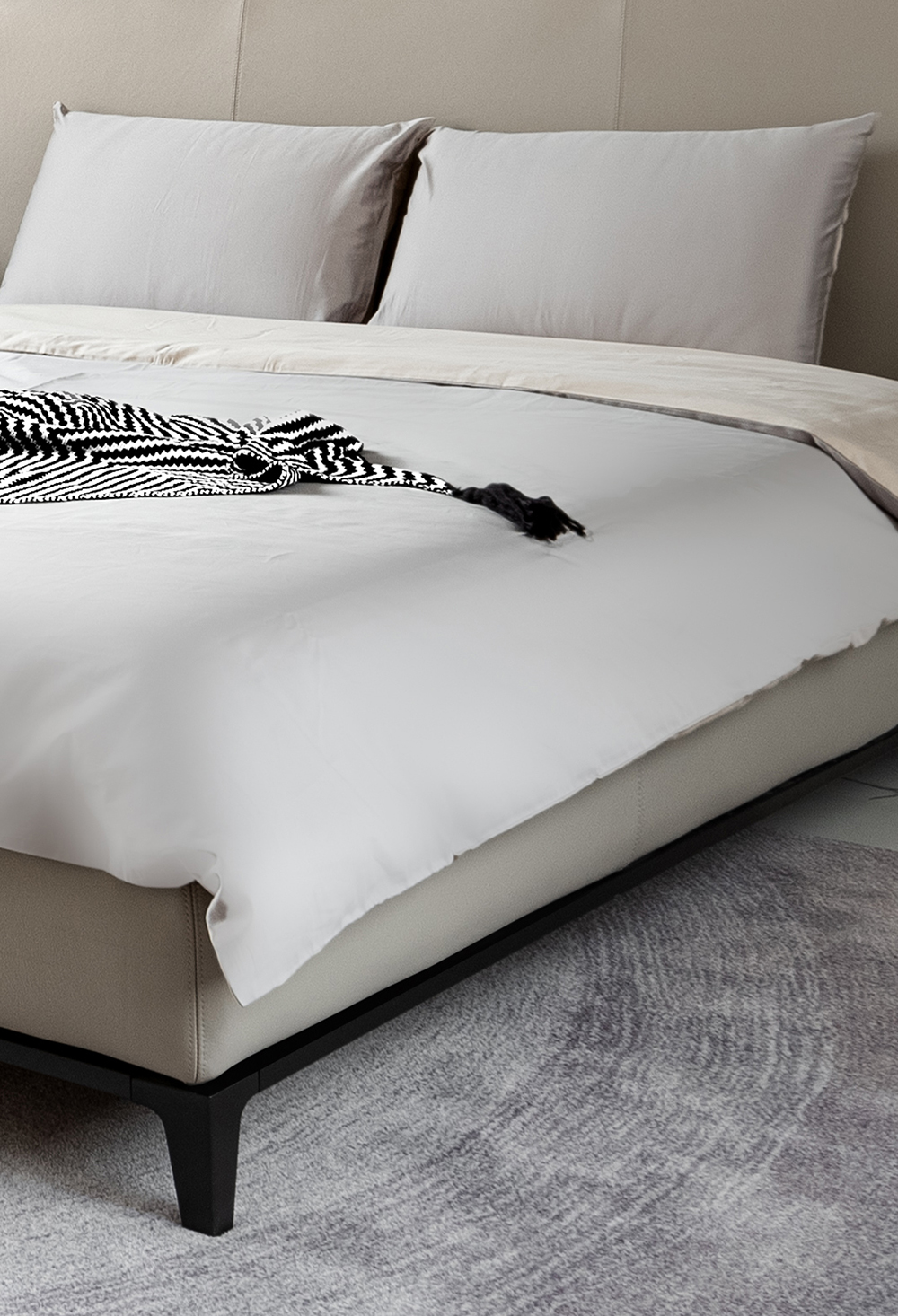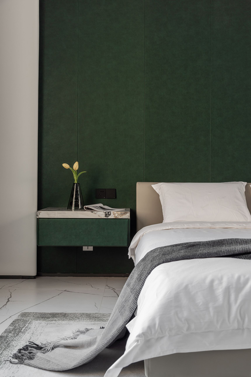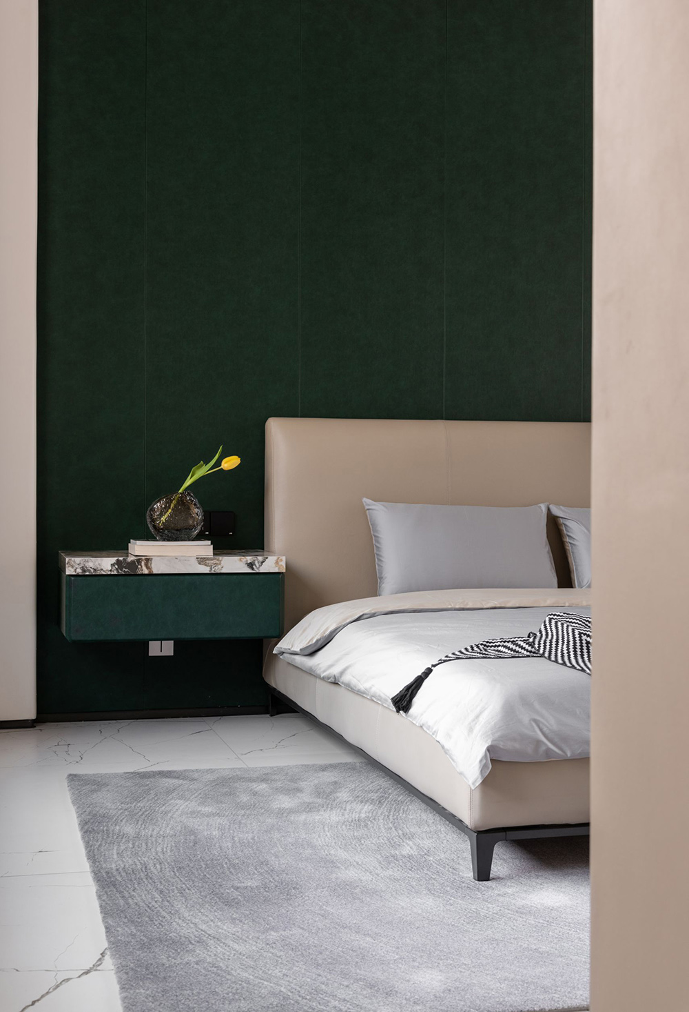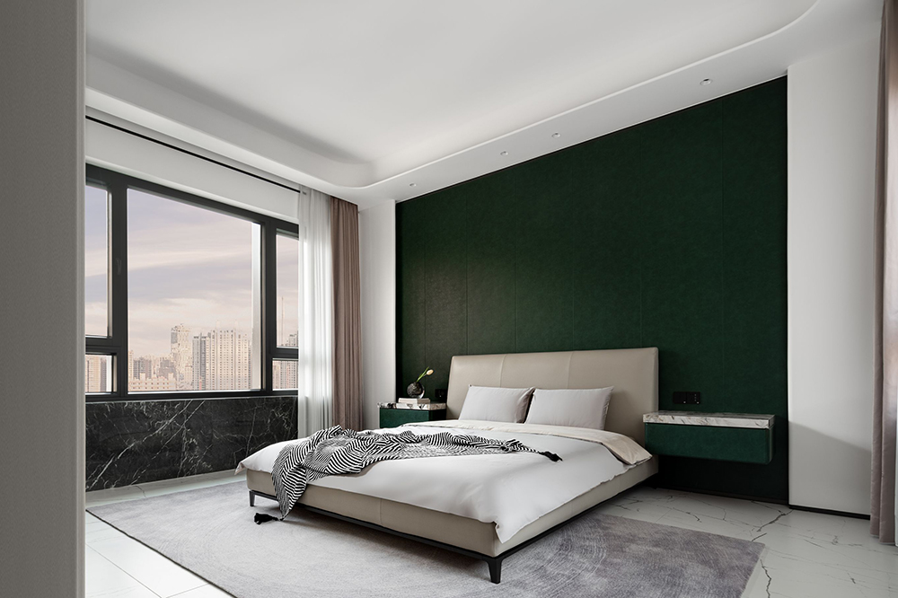 以大面积松绿背景墙为基调,配以CAMERICH锐驰的「新月」床,高背的床头设计带来惬意的坐靠体验,挑空的锥形腿塑造了挺拔的姿态,和两侧悬空的同色屉柜完美契合。加之波纹线条的晕染地毯,轻轻地,将雅致平和的格调凸显。