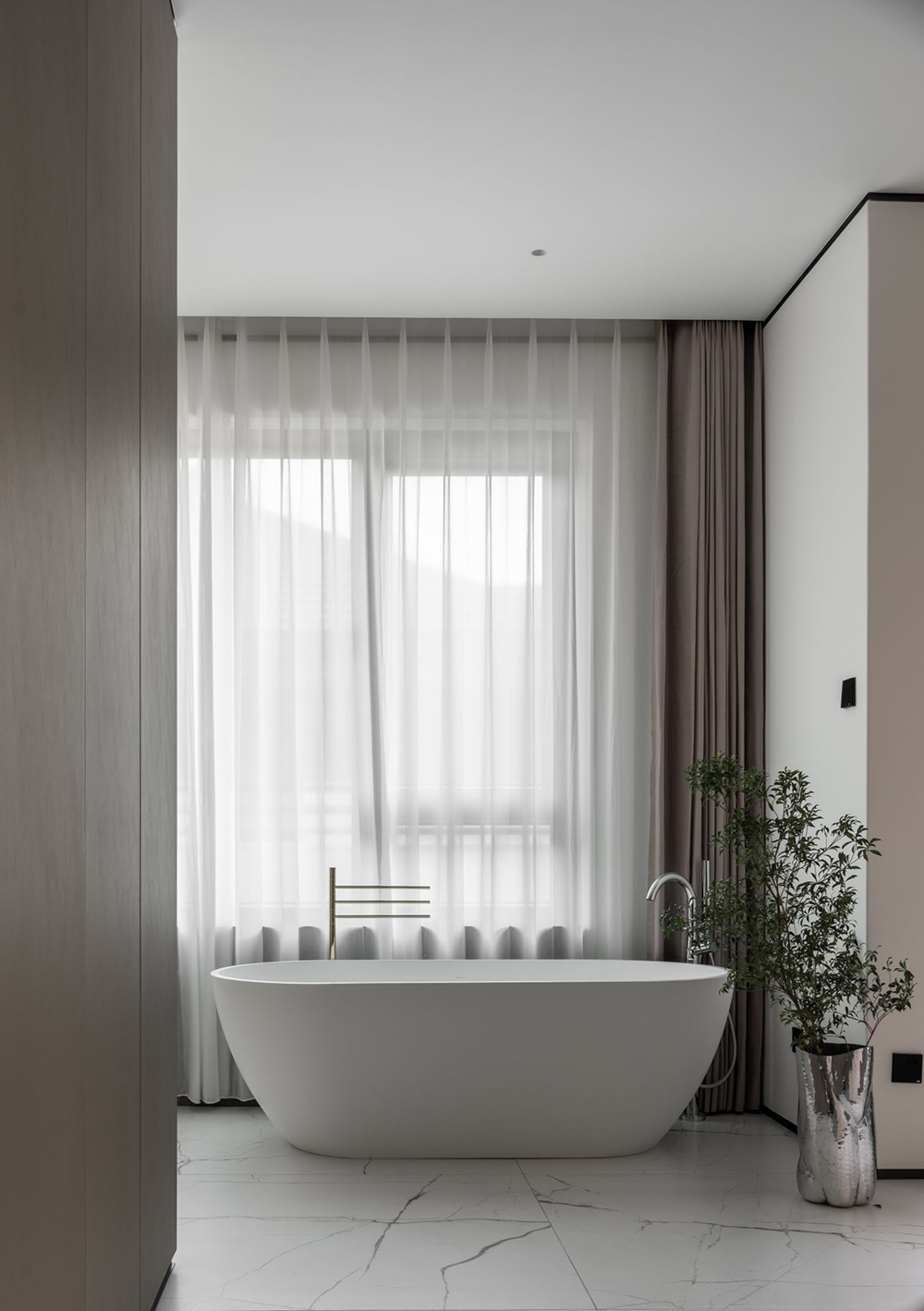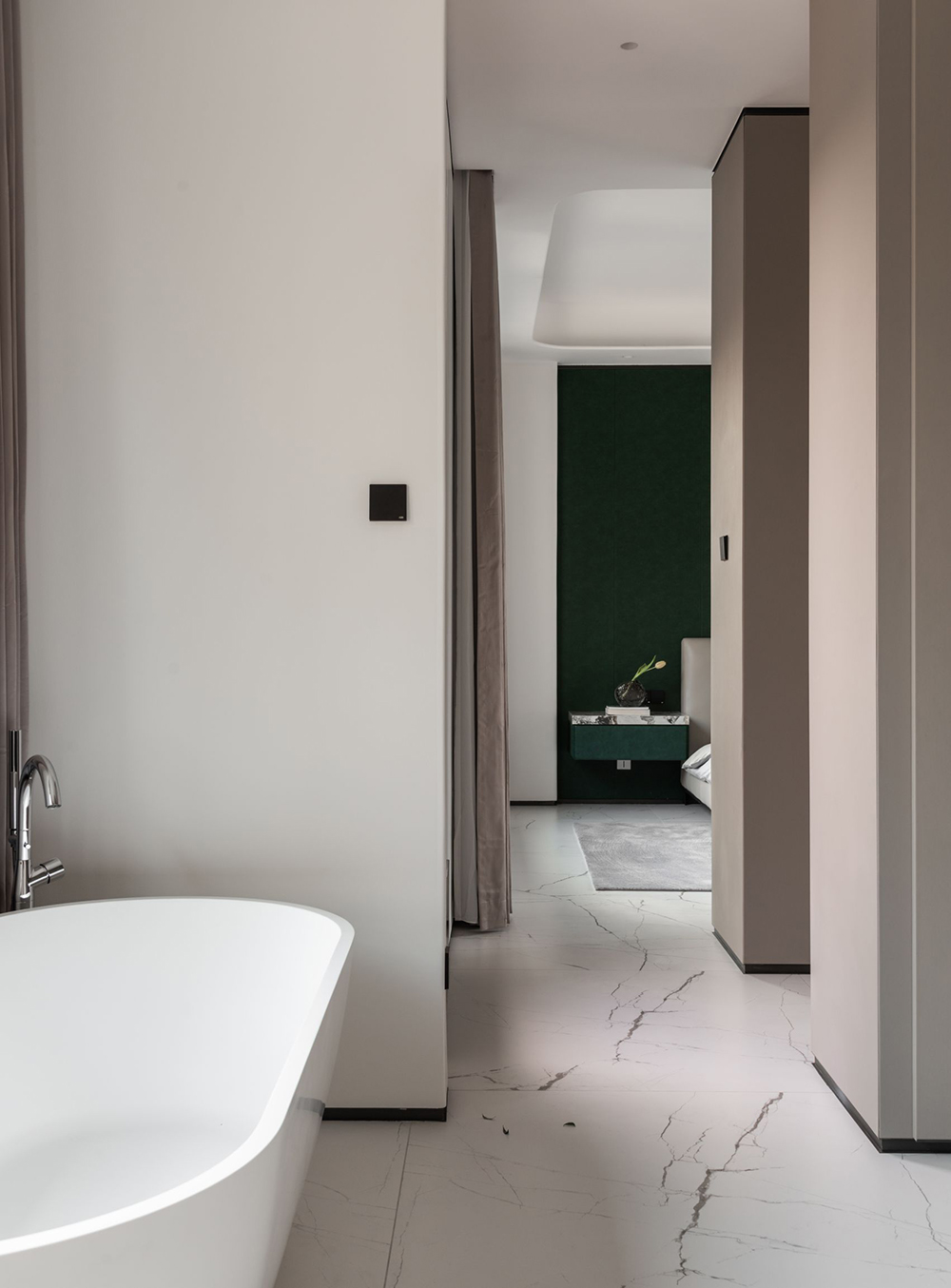 与卧室相连的衣帽间,没有墙作阻隔,而是采用柜体组合的方式,将此个私密空间打造成环形动线,从哪个方向,都可以抵达、拿取、收纳……甚至还将浴缸安于深处临窗的位置,精致松弛的设计,透露着设计的思考与关怀。
