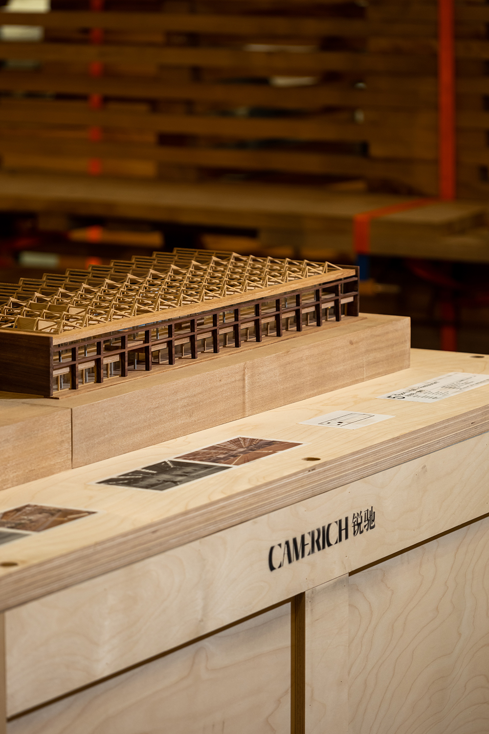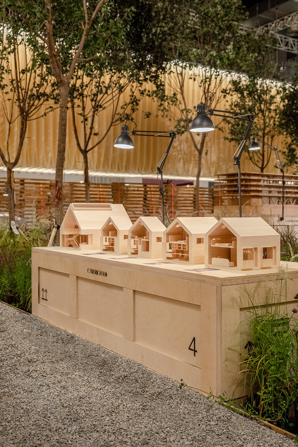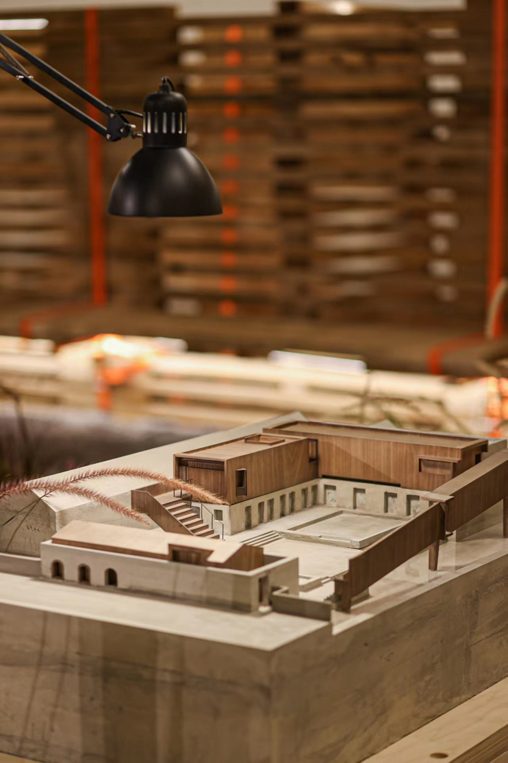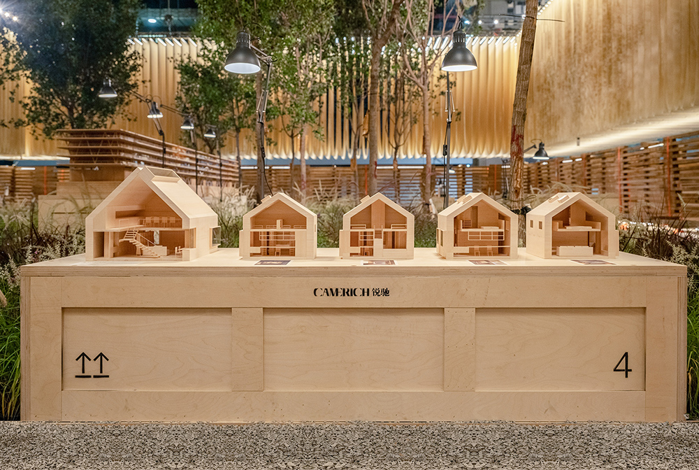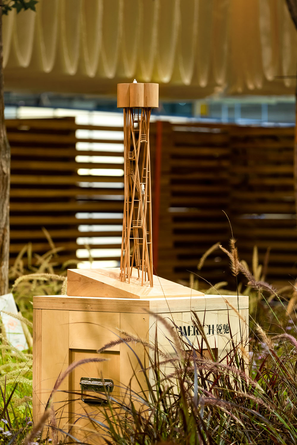 建筑模型的展台,即是运输时所装载的木箱本身,展览结束后模型将被原箱寄回。展台灯具将运回北京园区的工作营,而营造周圈氛围的线性灯带将用于嘉兴工厂的辅助空间照明。