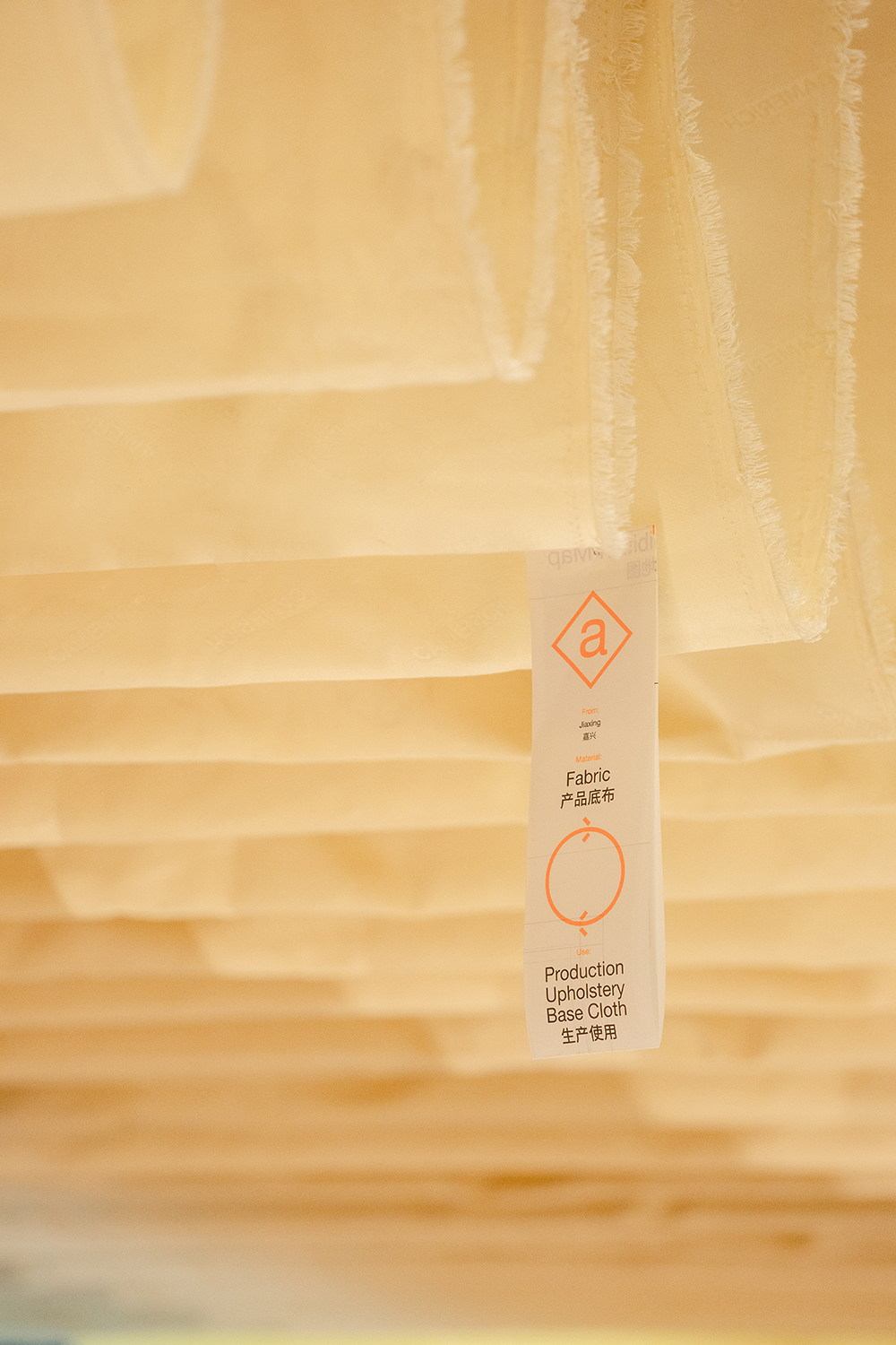 所有布展材料均保持原始和真实状态不被破坏。展区四周的帷幔采用锐驰沙发底布面料,以弯折的方式被悬挂起来,避免裁切造成的浪费。展区周围的木材来自于锐驰的实木产品基材,在展区中交错叠放,并使用捆绑带进行固定,避免使用钉子对基材造成损耗。