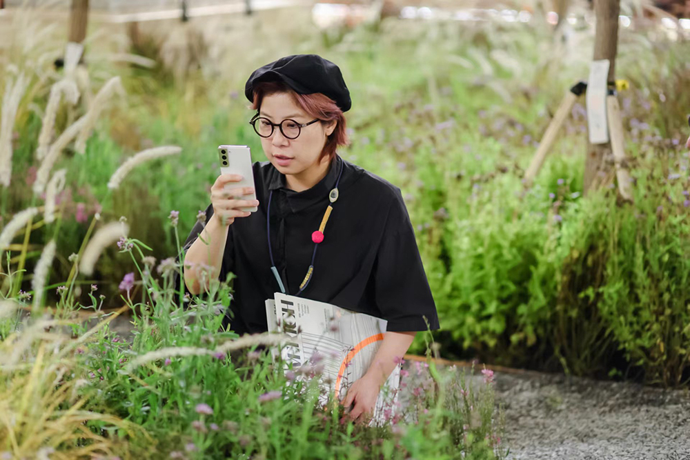 在柔和的光线和安静的氛围中,观展者可以在繁忙中稍作停顿,来到【中转花园】小憩、闲坐或是交谈,并可以领取一份由回收纸张和环保油墨制成的专刊报纸,详细了解锐驰南北园区布局的规划方案,与其中所体现的社会责任和可持续原则。