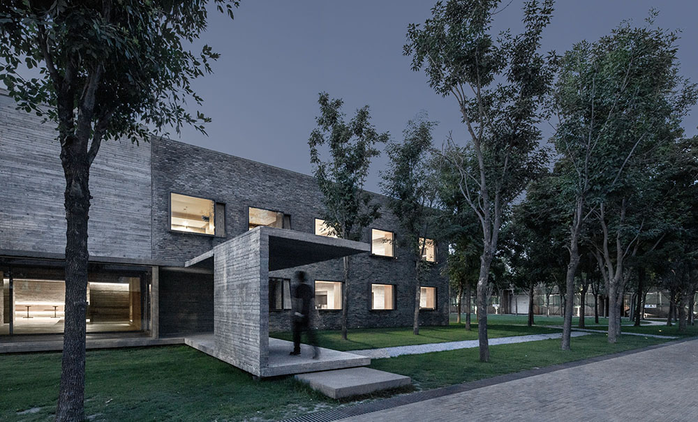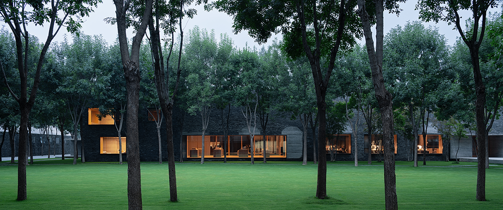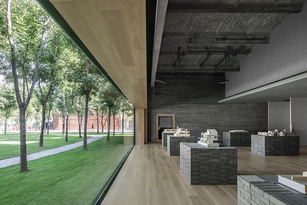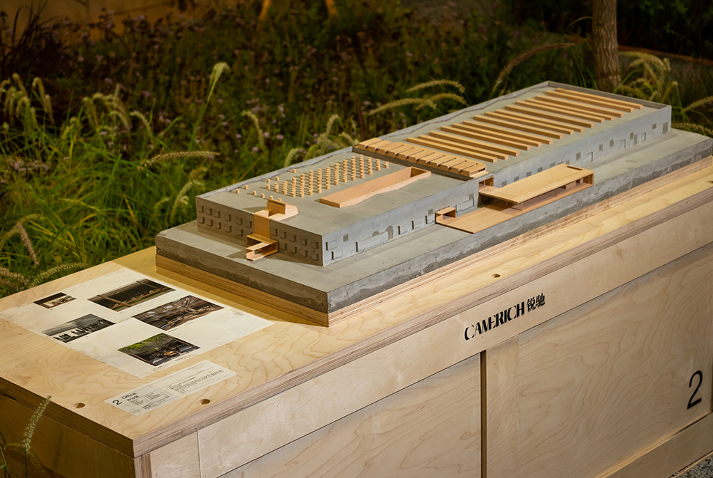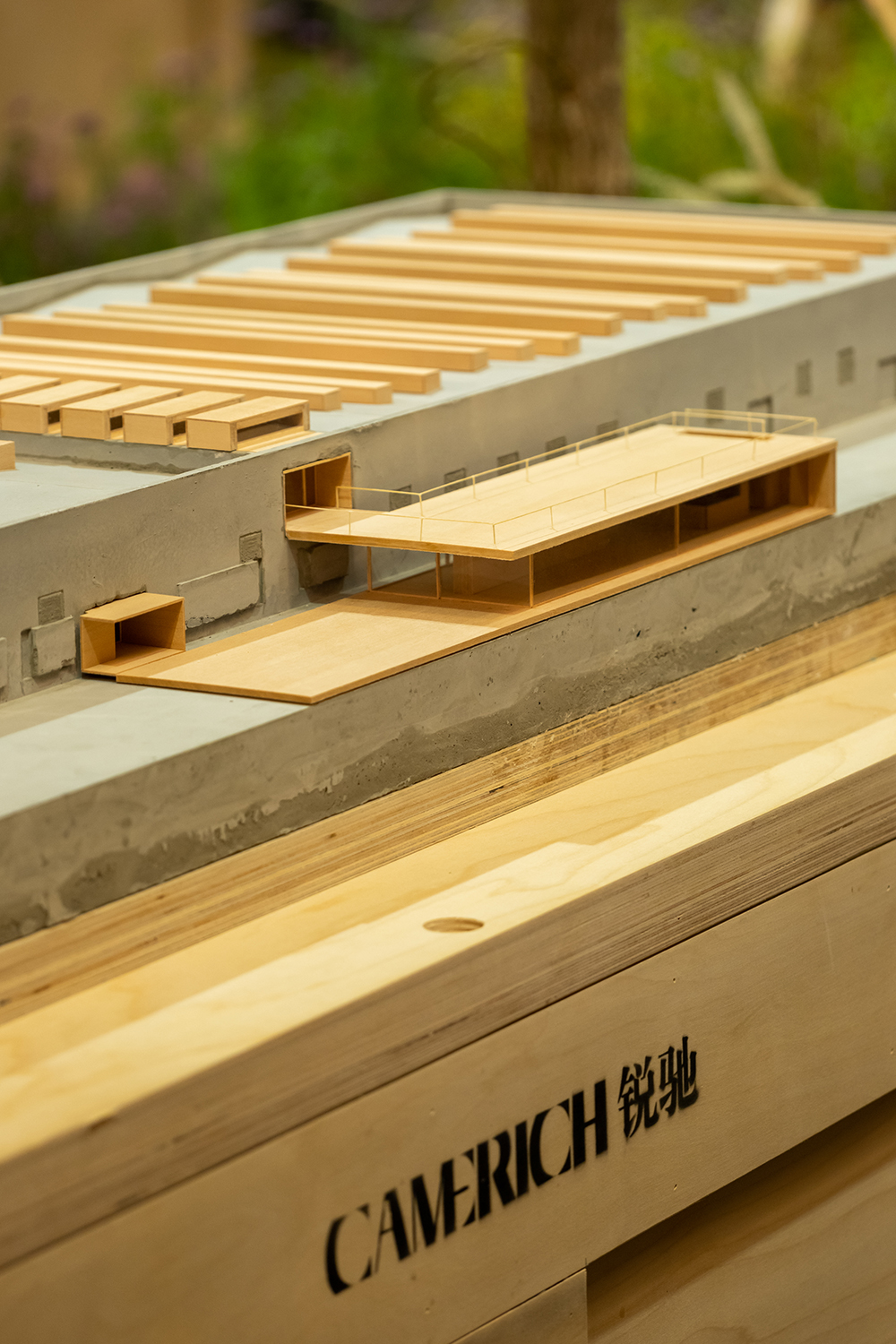 以花园作为展览中心,来源于锐驰北京园区的场地中心是一座花园,员工的工作和生活围绕在花园四周,日常往来于几座建筑之间,都要穿梭经过这里。也如同嘉兴园区坐落在一片自然与田园之中,员工能够通过工厂的落地窗眺望这片运河之滨。