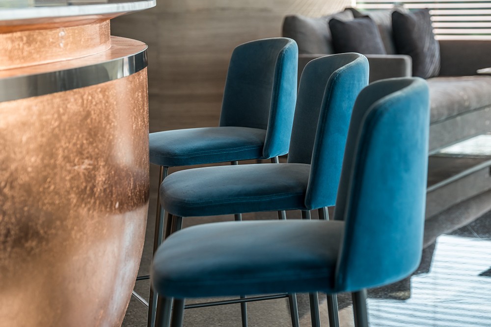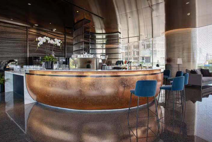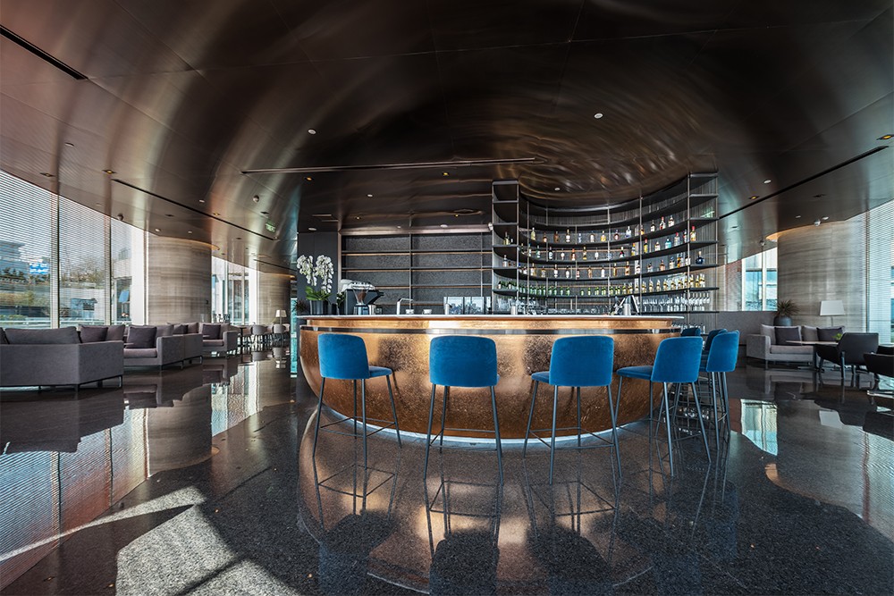 金属材质带来的神秘感,让人们犹如置身于一艘巨大的“船舱”之中。红铜色金属吧台和胶囊形的吊顶是最为吸引眼球的地方。蓝色的吧椅、灰色的沙发将柔美而沉稳的气质奇妙地融合在了一起,让整体空间格外的有Feel。