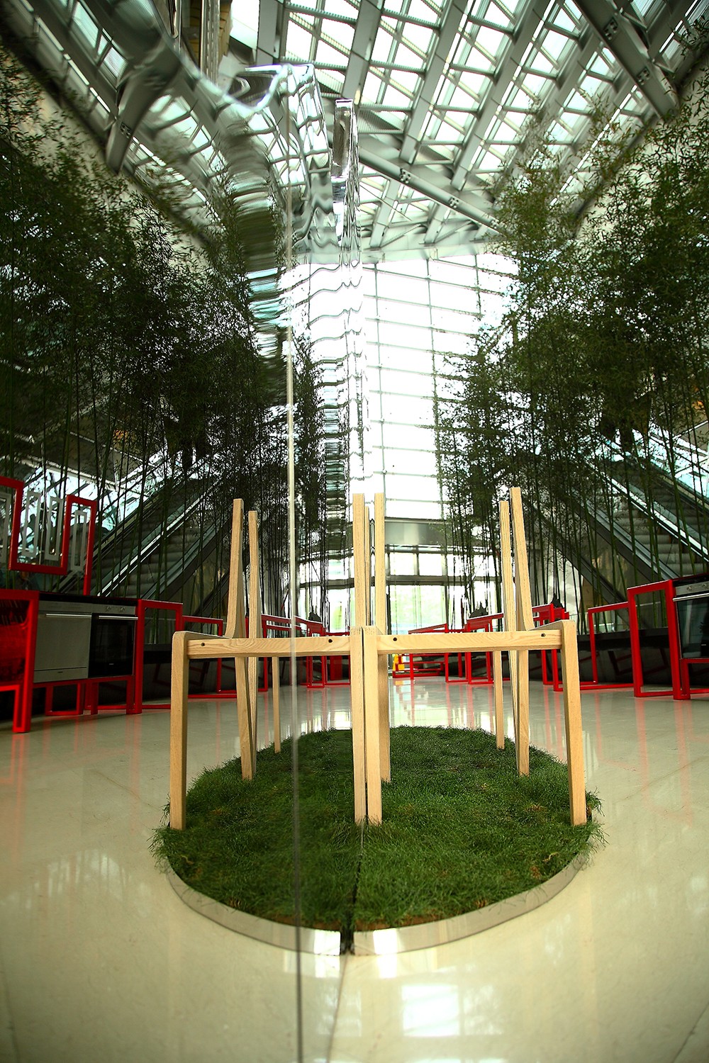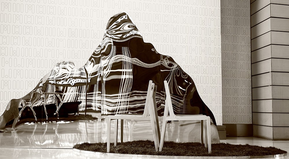 空间由线性语言通过中国建筑山墙的符号贯穿始终,模糊了空间、装置、家具、电器等元素的界限,使现实成为虚幻,启发每个人心中的“无边界”生活。锐驰对其明星产品FLORA椅进行了艺术化处理,以配合“无界”的主题。只保留了最原始框架的两把FLORA椅,背靠背紧贴在一起,与镜化处理的“山形”共同幻化出一种虚拟维度,启发人们对生活无限的遐想。